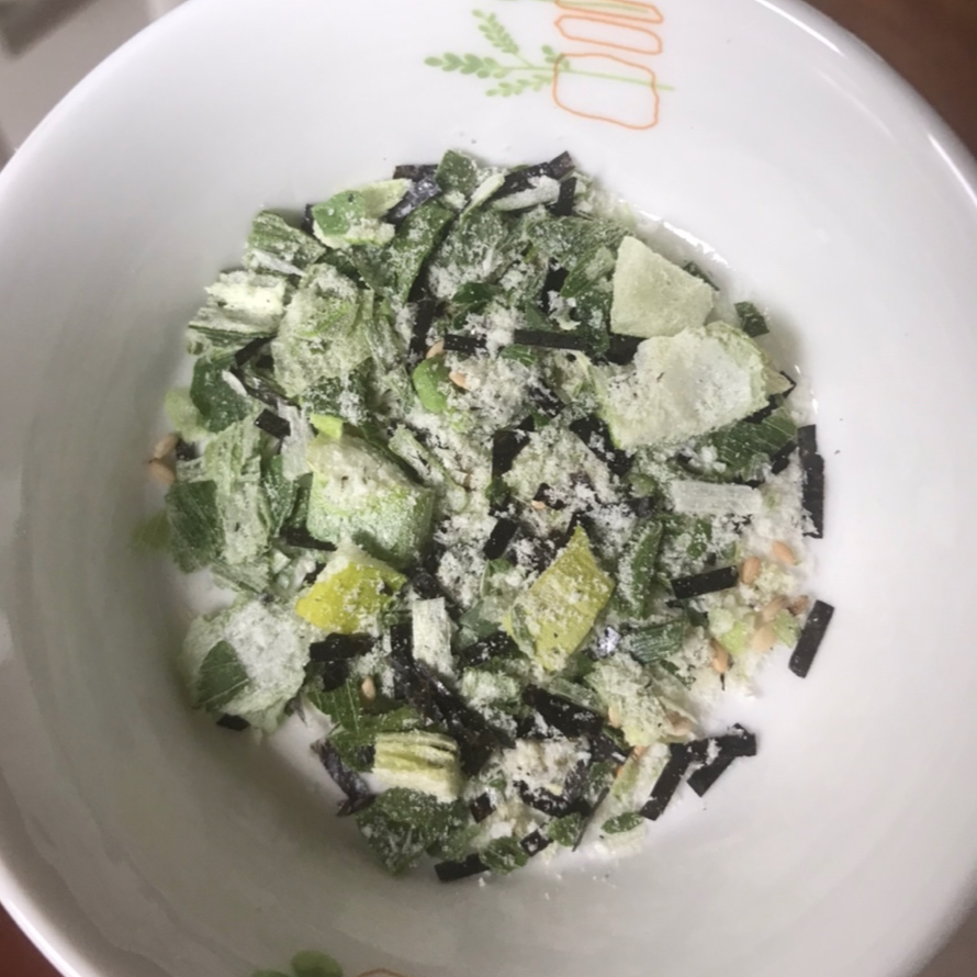 건더기 스프에는 다소 큼직하게 썰린 파랑 깨, 김, 그리고 흰색의 가루? 가 포함되어 있는데요,
