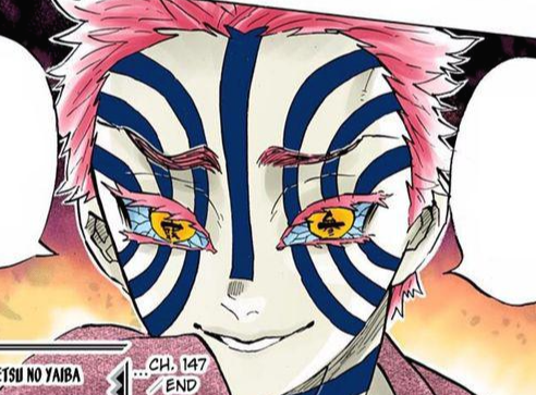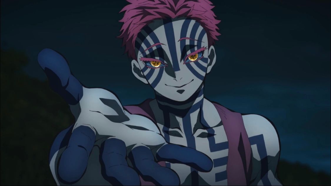 십이귀월의 상현 3. 130살 이상 된 남자 혈귀로, 173cm 74kg의 외형을 하고 있다. 파란색의 문신으로 전신이 뒤덮여 있으며, 강자를 좋아하고 약자를 혐오한다. 파괴살이라는 혈귀술을 사용하며, 자신의 힘에 대한 자신감이 넘치는 전투광이다. 식인을 그닥 선호하지 않아 최소한의 식인만을 한다. 식인으로 힘을 키우는 보통의 혈귀들과 달리, 단련으로 힘을 기른다.
