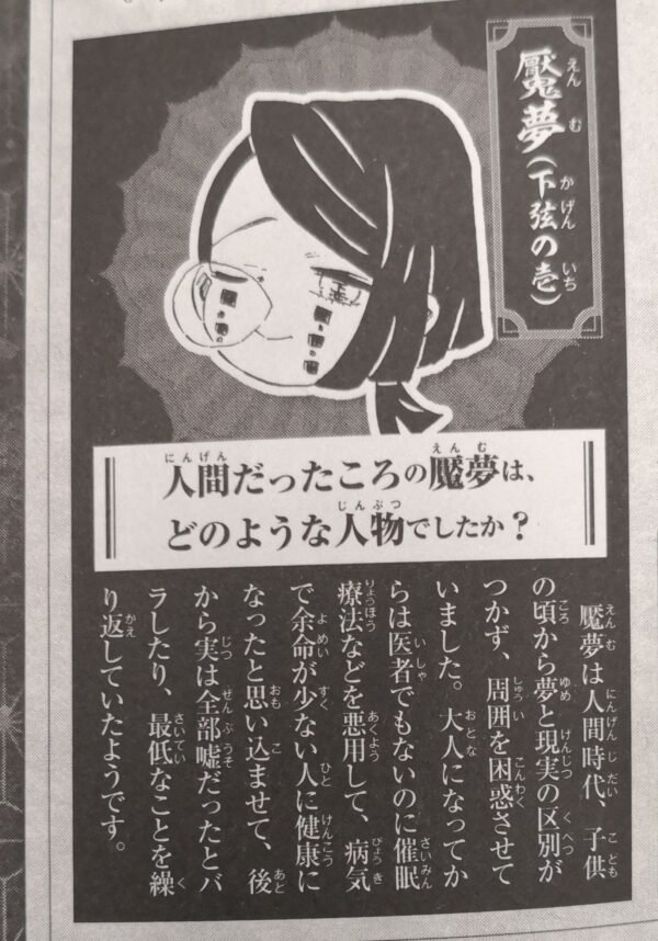 - 엔무가 혈귀술(강제 수면)을 사용할 때 본인이 직접 그 꿈으로 들어가 정신의 핵을 파괴하지 않는 이유는, 꿈속에 들어간 장본인 또한 꿈을 꾸는 주인의 심리에 깊게 영향을 받는 리스크가 있기 때문. 그리고 요괴에 대한 경계심이 강한 사람이나 귀살대원은 요괴에 매우 민감해서 요괴가 자신의 꿈 속에 들어오면 금방 꿈에서 깨어나 공격해 올 수 있기 때문이다.